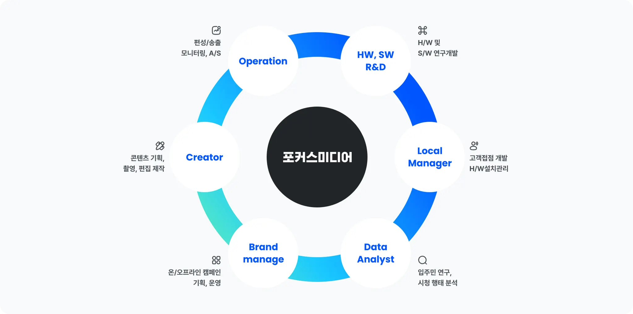 포커스미디어는 고객이 매일 같이 이용하는 생활공간에 엘리베이터 TV를 설치해 생활 속 필요한 즐겁고 유익한 콘텐츠를 전파하며 ‘사람과 기업을 이롭게 한다’는 창업이념을 실천해 나가고 있습니다. 우리는 고객의 생활을 이롭게 다채롭게 만들어가기 위한 모든 과정을 직접 고민해야 한다는 원칙 하에, ‘ R&D, 공간 개발, 엘리베이터TV 설치, 파트너사 발굴, 콘텐츠 제작 및 편성/송출, 모니터링, A/S, 시청 데이터 분석&전략 수립, 공간 프로모션’ 역량을 모두 내재화한 ‘풀밸류체인’ 사업 구조를 지켜왔습니다.