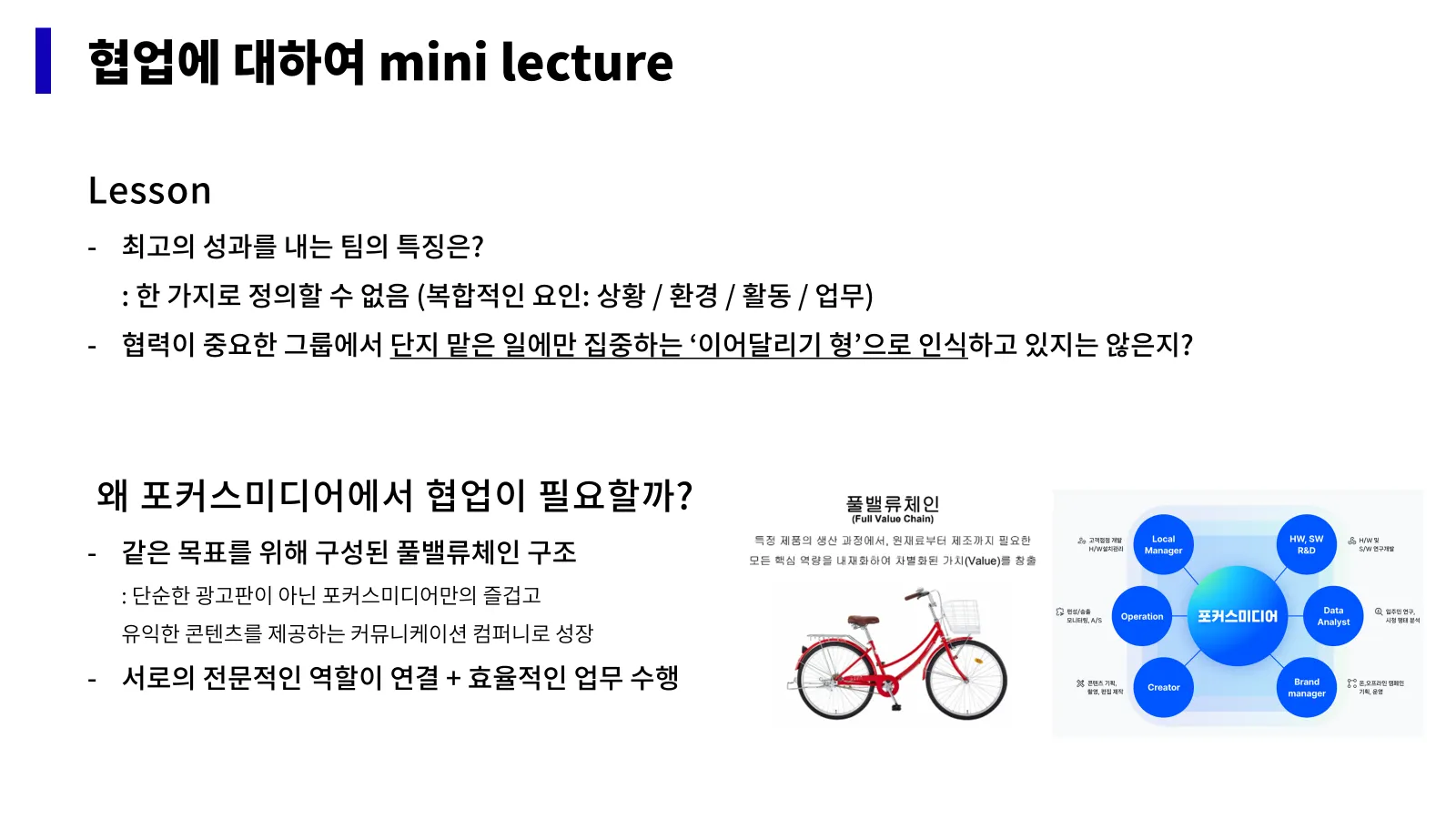 포커스미디어의 풀밸류체인 구조를 이해하고, 모든 구성원이 연결된 시스템 안에서 서로 협력하고 있음을 인식하는 중요한 시간이었죠. 마치 축구팀처럼 각자의 역할이 서로에게 영향을 미친다는 점을 강조했습니다.