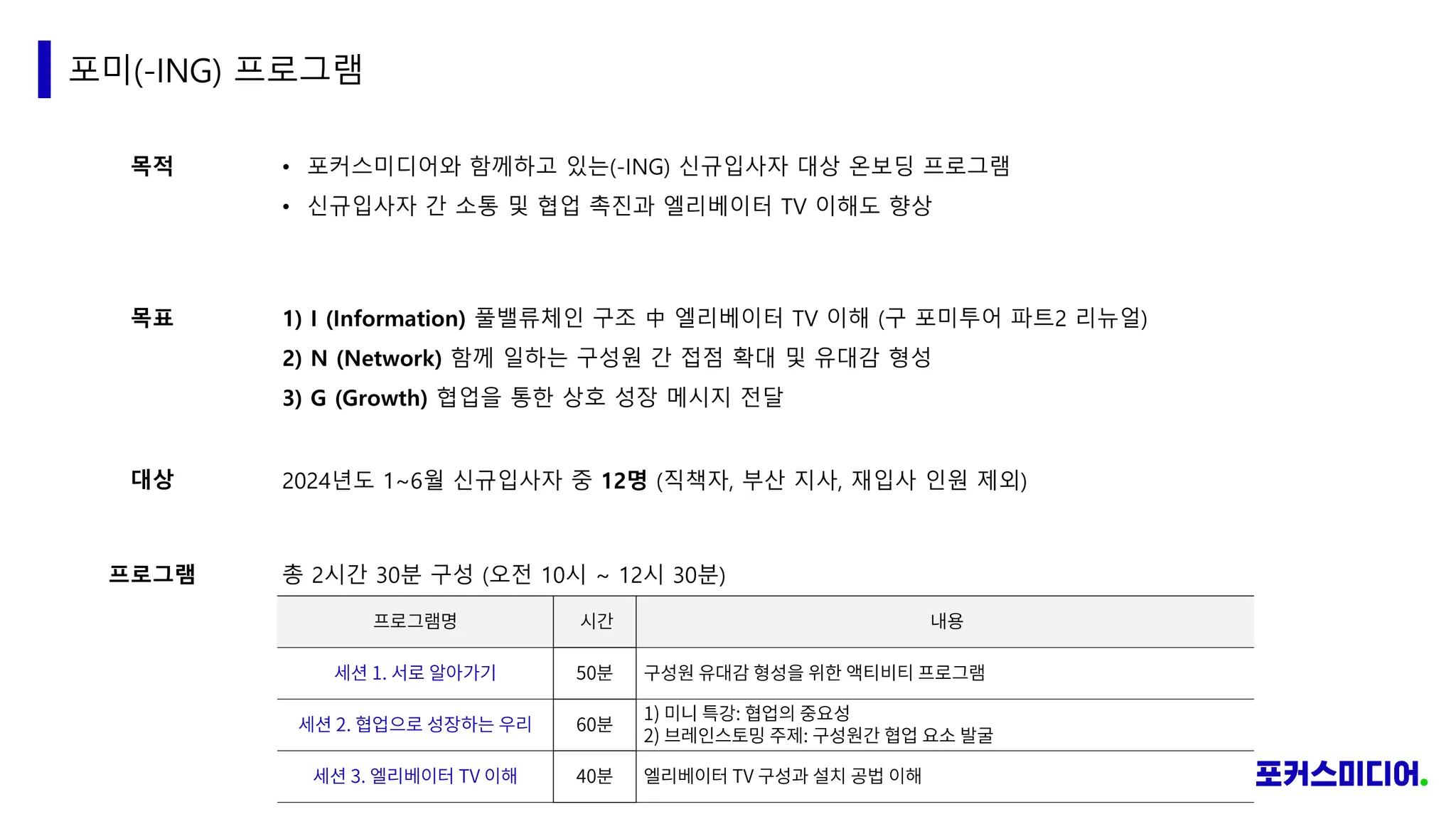 수시 채용으로 인해 ‘동기’라는 개념이 흐려지면서, 서로 소통하거나 협업을 요청하는 데 어려움을 겪는 경우가 많아졌는데요. 이러한 문제를 해결하고자, 신규 구성원들이 회사에 대한 이해를 높이고 자연스럽게 네트워킹할 수 있는 기회를 제공하기 위해 포미(~ING)를 기획하게 되었습니다.