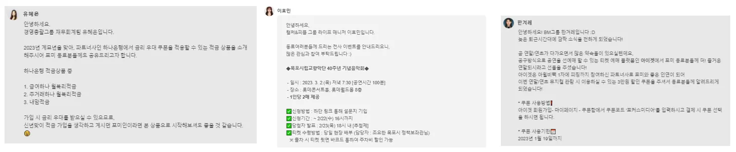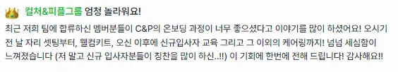 먼저 과제가 생겼으니, 토픽방을 새로 개설해야겠죠? 컬처&피플 그룹 컬처리스트 세은님의 주도하에 개설된 ‘[C&P] 2022 불꽃축제 준비위원회’ 토픽방. 이곳에서는 과연 어떠한 이야기가 오고 갈까요?