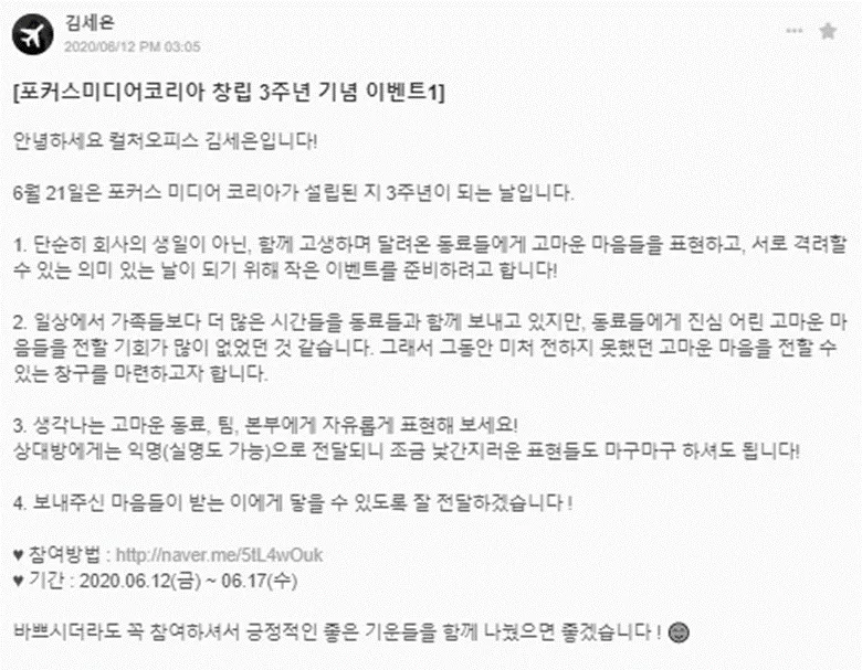 그렇게 준비하게 된, ‘포미와 함께하는 불꽃축제’ 프로젝트. 다소 촉박한 4일이라는 준비 기간동안 우리 컬처&피플 그룹 동료들이 포미의 일하는 방식(5way)을 기준으로 어떠한 고민을 토대로 발굴>제안>실행하였는지 함께 살펴보아요.