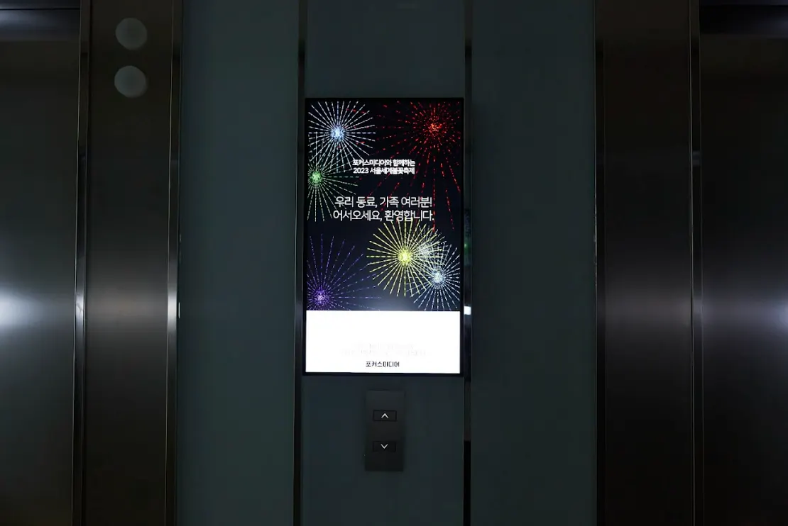 엘리베이터TV 사업을 운영하는 포커스미디어. 방문객을 향한 웰컴 메시지 또한 평범할 수는 없겠죠? FKI타워 고층부 엘리베이터를 타고 45F에 내리면 포커스미디어 사업의 근간을 한 눈에 담을 수 있답니다.