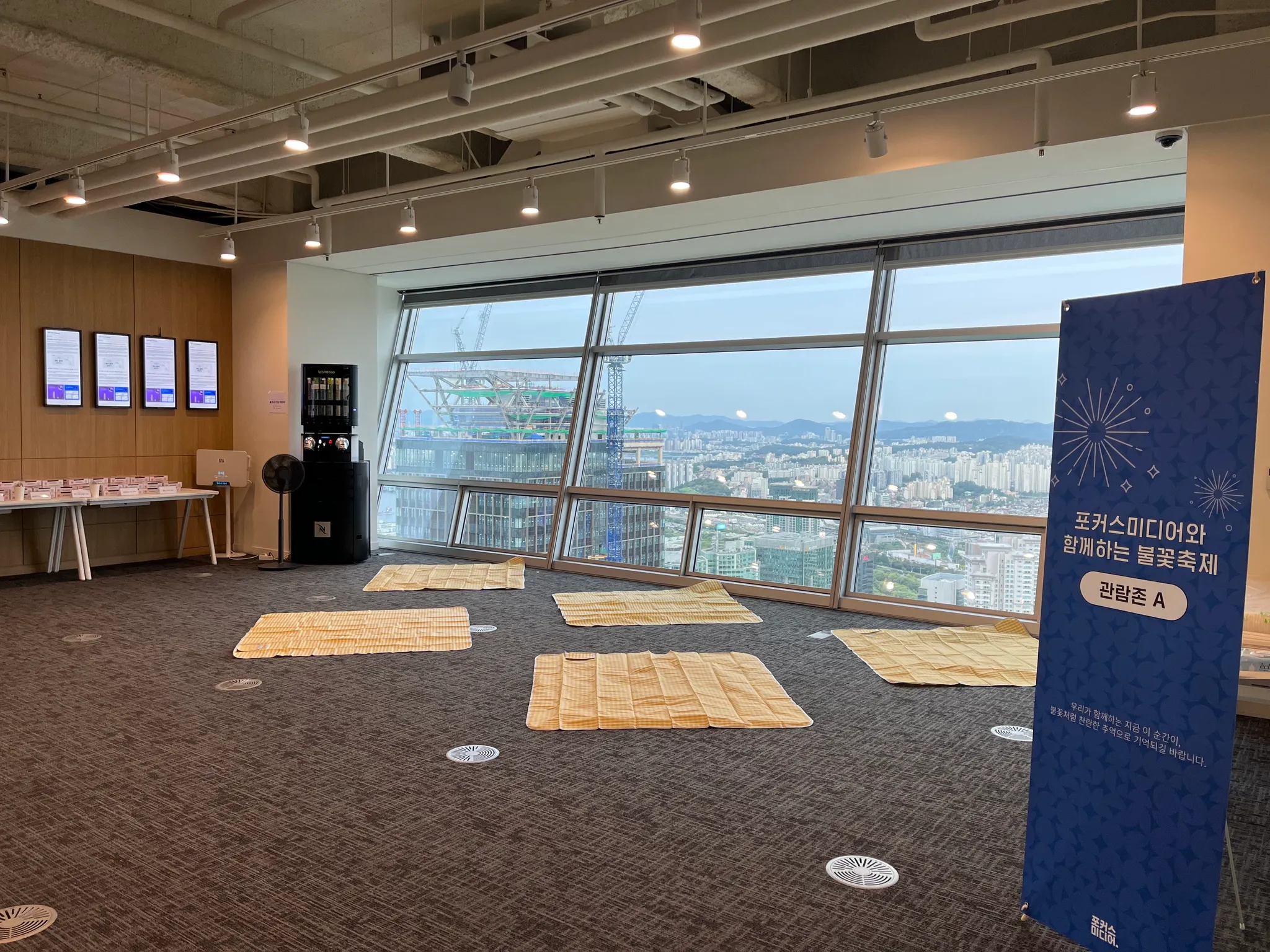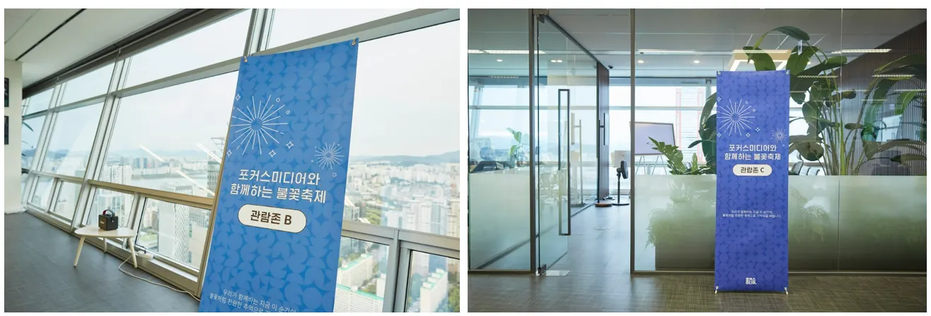 사무실에 입장하면 곳곳에 설치된 관람존 배너를 확인할 수 있어요. 관람존마다 볼 수 있는 불꽃의 느낌이 다르니 참고하여 원하는 위치에서 편안하게 관람해 주시면 돼요.