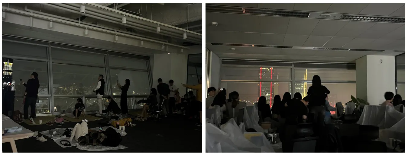배를 채우니 어느새 밖이 어둑어둑해졌어요. 행사 시작까지 이제 10분 남았으니, 사무실 전체 소등 후 떨리는 마음으로 첫 불꽃이 터지길 기다려 볼까요?