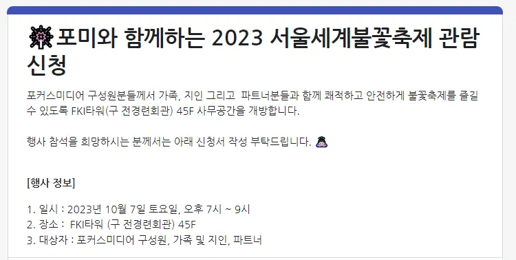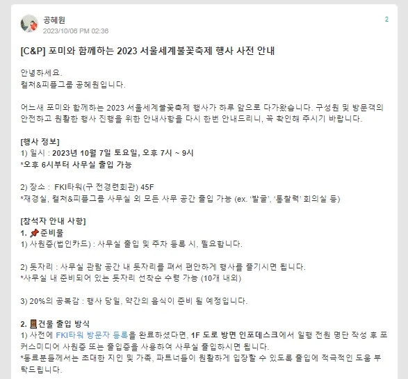 안전하고 원활한 행사 진행을 위해 관련 안내 사항도 여러 차례 공지했어요. 공지문에는 10월 7일 행사 참석자의 준비물은 무엇이며, 함께하는 가족 및 지인, 파트너에게는 주차 등록, 건물 출입과 관련해 어떤 내용을 전달 해야 하는지 등이 담겨있었답니다.