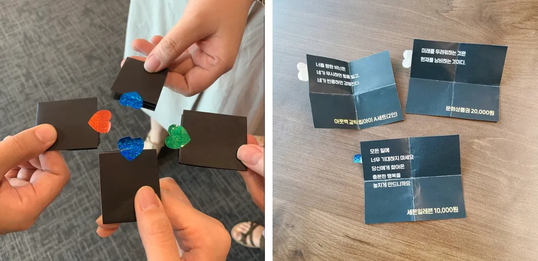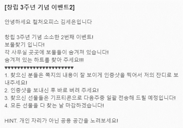 짜잔, 동료분들이 찾은 보물에는 선물뿐만 아니라 하루를 더 긍정적으로 보낼 수 있는 명언까지 담겨 있었는데요. 여기서 감동 포인트는 보물을 찾지 못한 동료에게 본인이 찾은 보물을 선뜻 나눠주시는 동료분들이 계셨다는 것. 마음까지 예쁜 우리 동료분들.