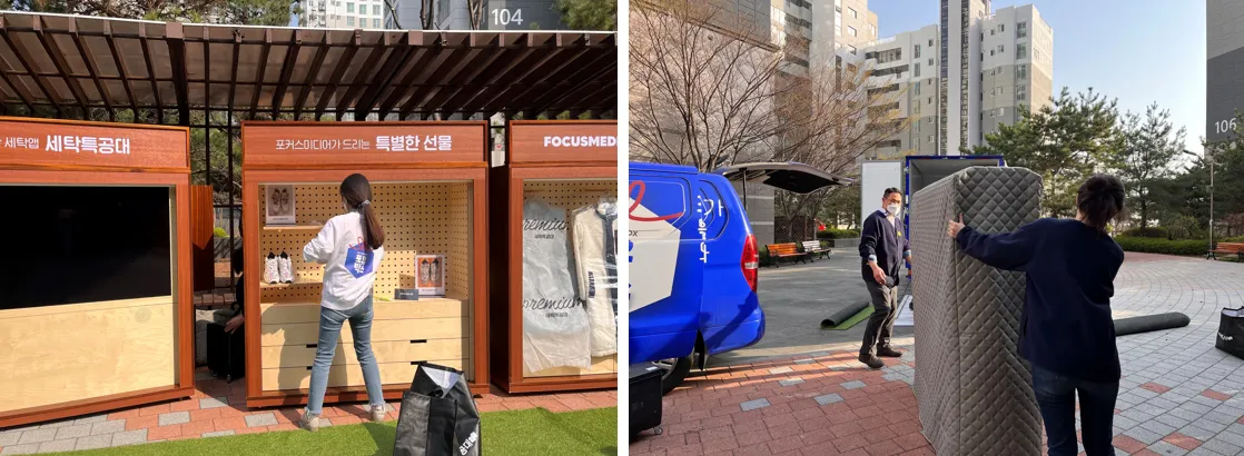그렇게 저희는 매주 토요일, 입주민이 거주하고 생활하는 공간에 찾아가 입주민 생활에 유익함을 줄 수 있는 파트너사의 제품과 서비스를 직접 전달하는 포미의 오프라인 프로모션, ‘포미데이’을 시작하게 되었습니다. 딱 포커스미디어다운 프로모션 아닌가요?