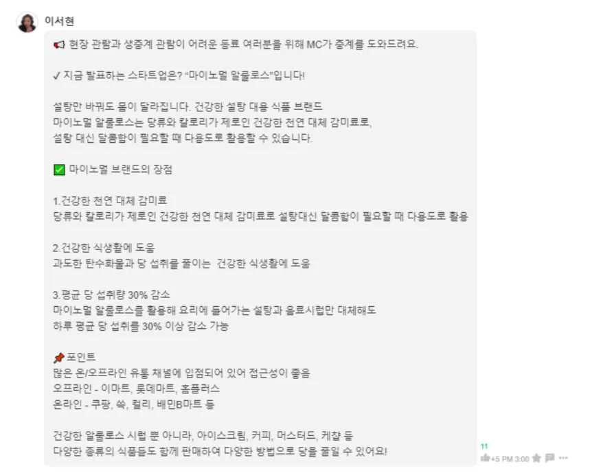 “잠시 후, 14시 10분에 치열한 1차 심사를 통해 선발된 혁신적이고 유망한 6개 스타트업들의 피칭이 시작될 예정이니 자리에 착석해 주시기 부탁드립니다.”