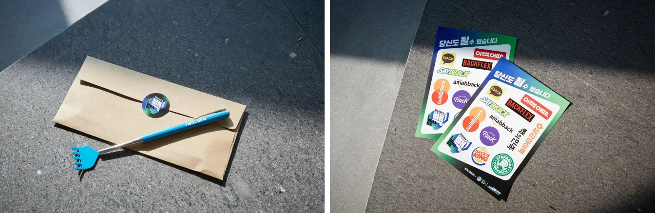 인포데스크에는 앞풀이 때와 마찬가지로 각자의 소속과 이름이 적힌 목걸이 명찰 그리고 기념품인 효자손 등긁개, 스티커, 포스터가 준비되어 있었어요.