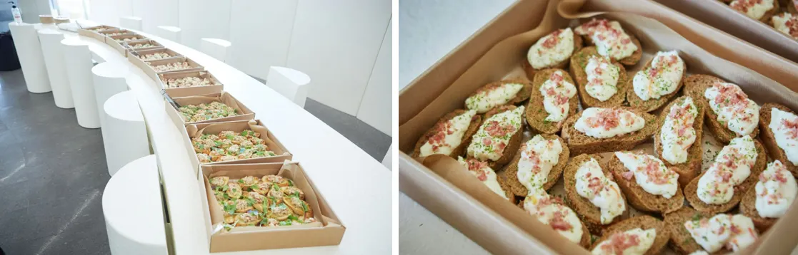 먼저, 바게트 위에 다양한 재료가 올라가 있는 쉬림프, 토마토, 크림치즈 등의 부르게스타가 테이블 가득 자리하고 있었어요.