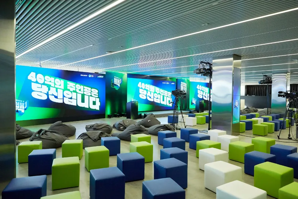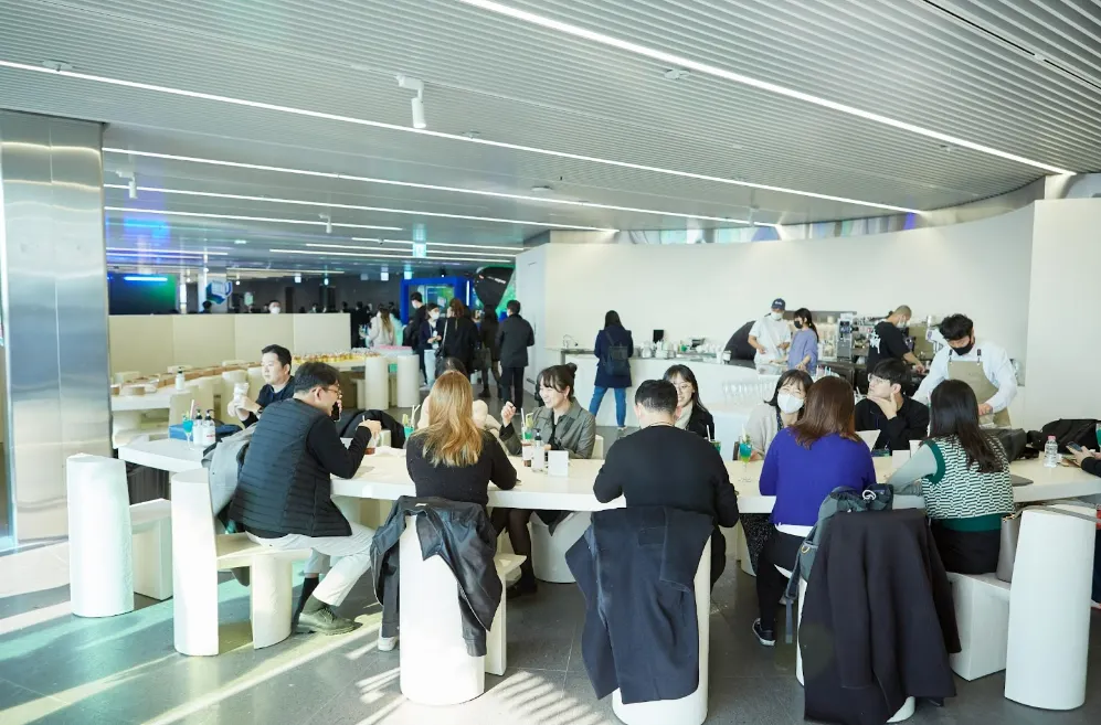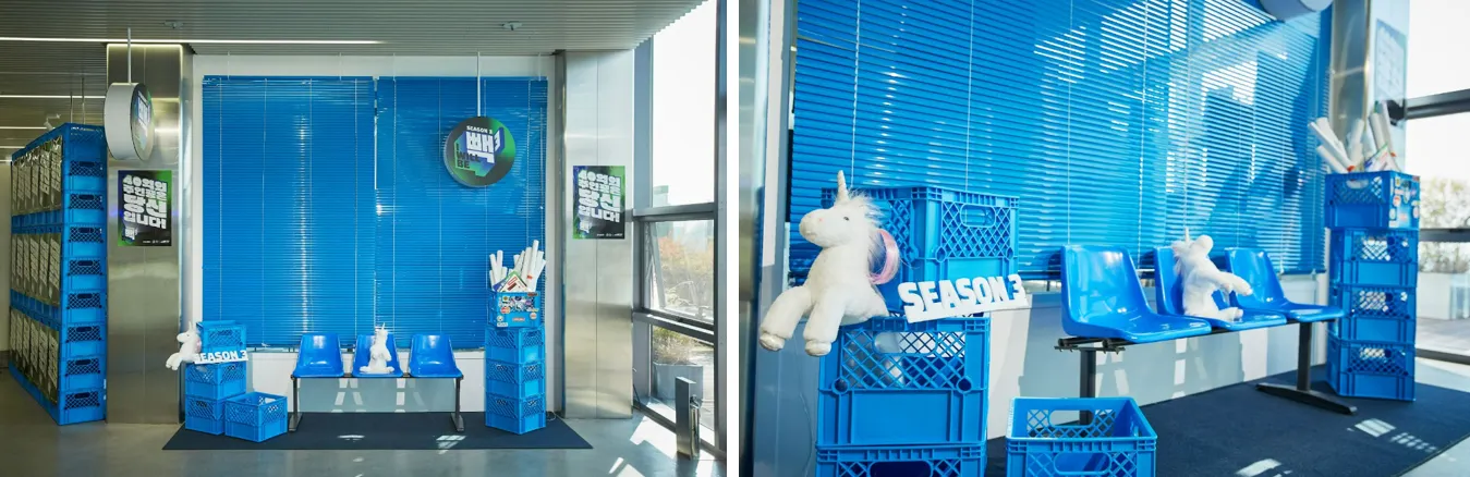 설레는 마음으로 문을 열고 들어가자 눈앞에 펼쳐진 이 화려한 장면. 사진에서 보이듯 공간 곳곳에 있는 모든 것들이 우리의 아이덴티티를 담은 컬러, 포커스 블루와 포커스 그린의 조합으로 꾸며진 모습이 먼저 눈에 띄었는데요.