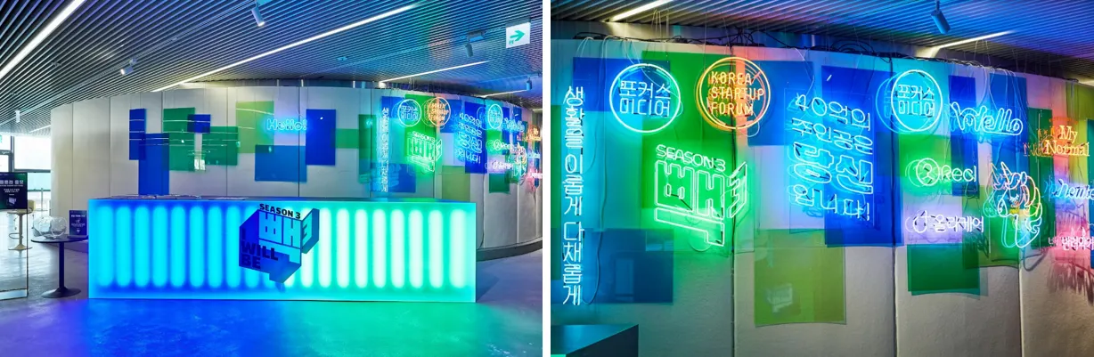 특히, 저는 한쪽 벽면을 포커스미디어와 피칭데이에 함께하는 6개의 스타트업명을 화려한 LED 네온사인으로 표현한 것이 가장 인상적이었어요. 동료분들이 공들여 준비한 이 공간이 일회성으로 끝난다는 게 너무 아쉬울 정도로 말이죠.