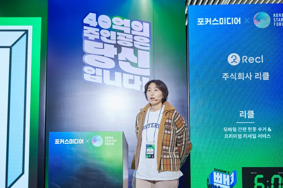 두 번째 순서로는 모바일 간편 헌 옷 수거&프리미엄 리세일 서비스를 운영하는 ‘리클’의 양수빈 대표님 피칭이 진행되었어요. 참고로, 이날 양수빈 대표님께서는 실제 본인의 회사, 리클 스토어에서 판매되는 옷을 입고 오셨답니다.