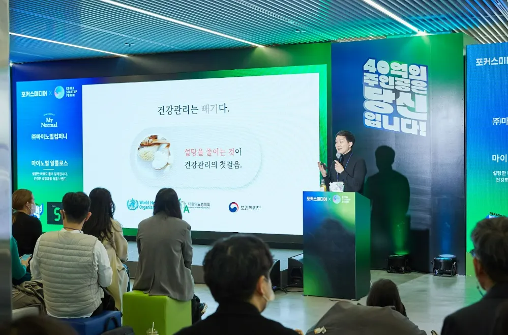 1부의 마지막 순서로는 건강을 위한 프리미엄 저당 식품 브랜드 ‘마이노멀 컴퍼니’의 이형진 대표님의 피칭이 진행되었어요.